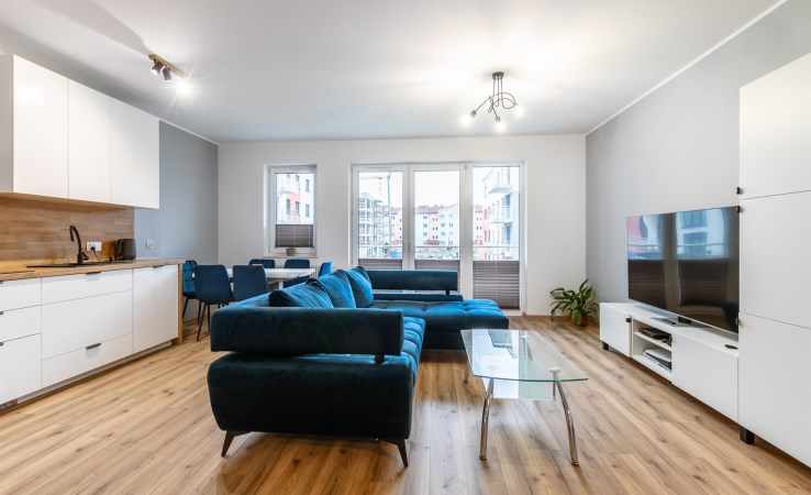 Mieszkanie o powierzchni 95,37 m² i znajduje się trzecim piętrze budynku z windą. Składa się z salonu połączonego z aneksem kuchennym, pomieszczenia gospodarczego (spiżarnia), trzech sypialni, łazienki z wc. Całość została urządzona w eleganckim i nowoczesnym standardzie.